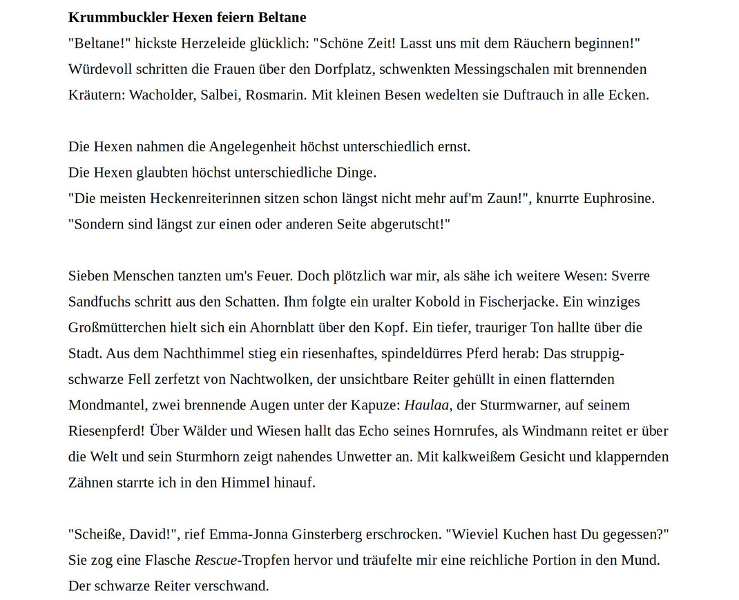 Vorurteilsfrei öffnet sich David verschiedenen Gruppen vom Krummbuckel: Feministisch-esoterischen Neu-Hexen, die die Große Mutter anbeten oder brutalen Wikinger-Bikern um den Likedeeler Eirík Blutaxt. David bewertet nichts und hält den Mund. Deshalb ist er bald überall beliebt. Glaube bestimmt die Wahrnehmung: Hat David mit abergläubischen Bauern zu tun, nimmt er selbst die Welt der Naturgeister wahr: Die Riesin Angrboða im Boden, den finsteren Sturmwarner Haulaa auf seinem Riesenpferd oder den Klabautermann Sverre Sandfuchs. Erst in der Schule öffnet sich die Schere zwischen dem, "was gelebt wird" und dem, "was gelehrt wird". Mit wachsender Aufklärung verschwindet das Phantastische aus Davids Leben.