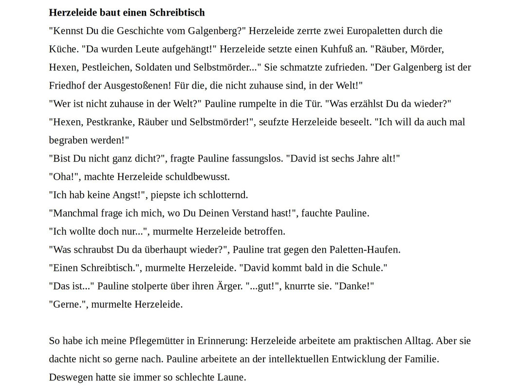 In kurzen Mikro-Geschichten skizziert David seine Kernfamilie: Die wütende kleine Schwester Lilith, den lässigen großen Bruder Jörn, die verträumte Herzeleide. Und ihr gemeinsames Leben im Dorf.
