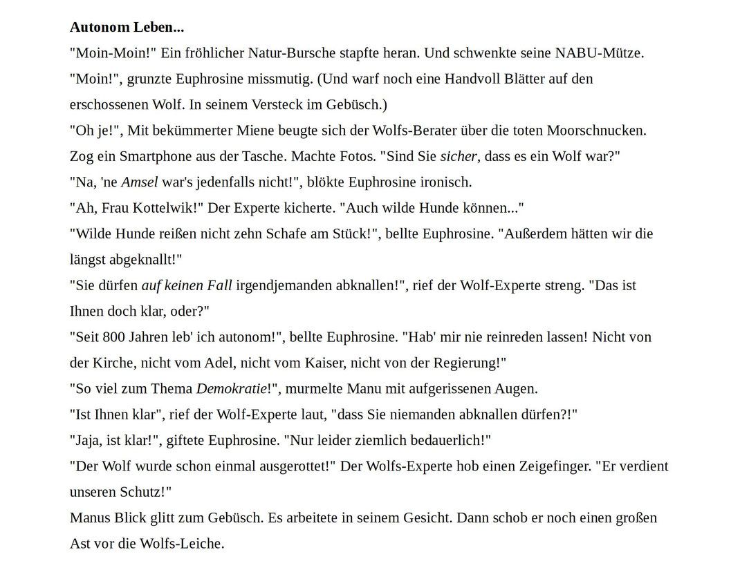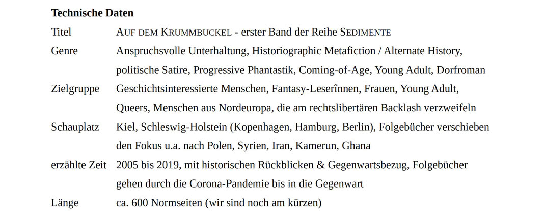 Das Kieler Museumsdorf Kottelwik wird im Volksmund "Krummbuckel" genannt, weil die alten Bauern glauben, auf dem gebeugten Rücken der versunkenen Riesin Angrboða zu leben. Seit der Frühbesiedelung des Dänischen Wohlds vor 800 Jahren führt die Schäferin Euphrosine Kottelwik die Bauern durch die Zeit. Und schafft ein fragiles Gleichgewicht zwischen lange lebenden Bauern, kriminellen Wikingern und modernen Ostsee-Touristen.