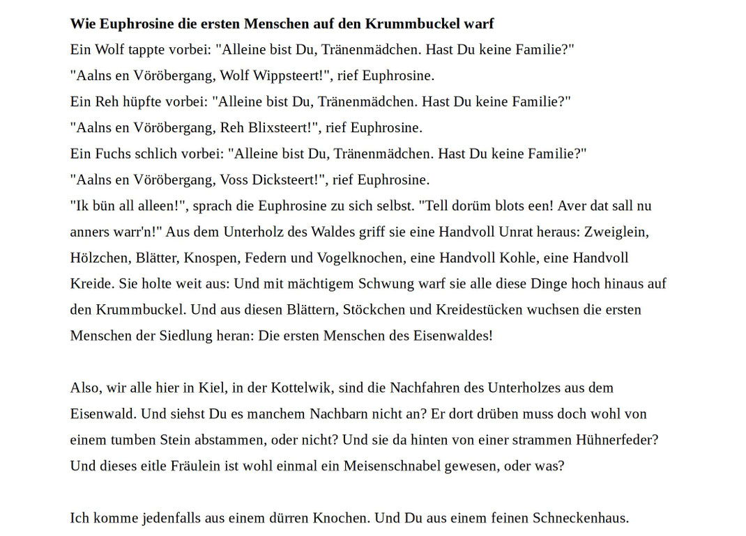 David sammelt Märchen und Legenden über Euphrosine, die auf dem Krummbuckel erzählt werden: Sie soll zum Beispiel die Zeit in die Welt gebracht haben. Und mit dem lieben Herrgott persönlich bekannt sein. Solche Geschichten werden erzählt, auf dem Krummbuckel. Der Dorfklatsch der Jahrhunderte identifiziert Euphrosine vor allem als eine Projektionsfläche für alle möglichen Themen und Probleme.