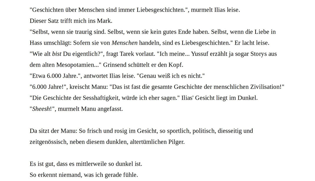 Nach seinem Abitur, im Herbst 2019, überlegt David, was er mit seinem Leben anfangen soll. Euphrosine will ihn auf dem Krummbuckel behalten. Manu will mit ihm ein modernes Leben in Berlin führen. David trennt sich von beiden: Von seiner Heimat und von seiner Gegenwart. Zu Beginn der Corona-Pandemie folgt er dem Krieger Ilias auf eine unvorhersehbare Reise: Um neue Teile der Welt zu entdecken, zeitlich und räumlich. An dieser Stelle endet das erste Buch.