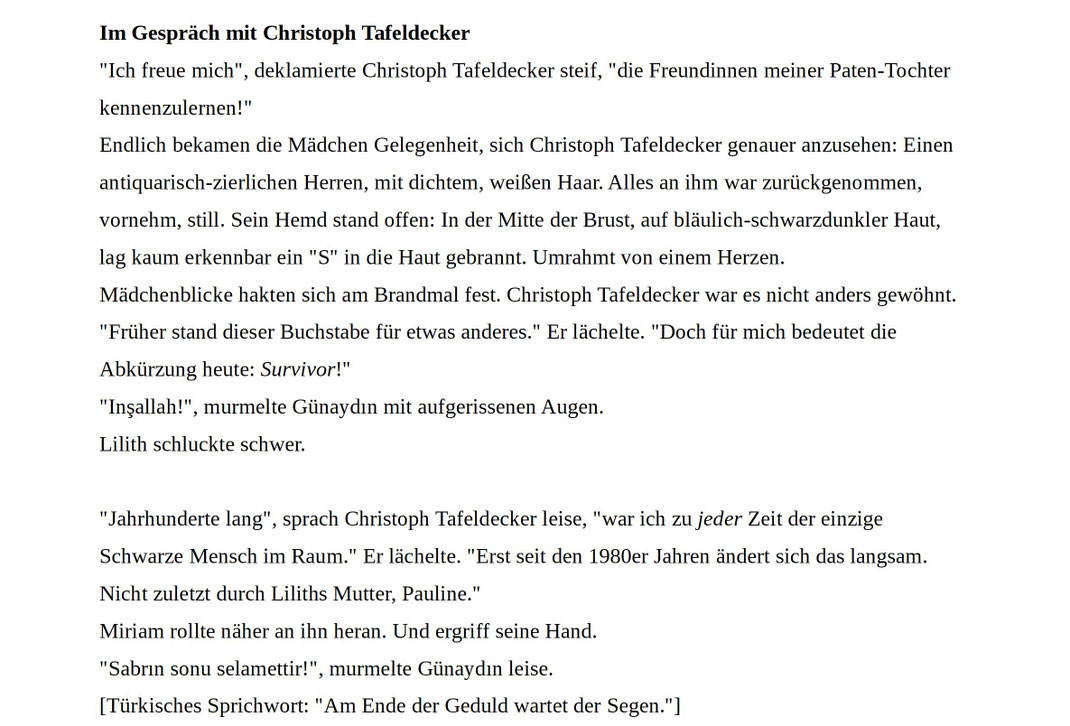 Christoph Tafeldecker teilt ein ähnliches Schicksal wie Anton Wilhelm Amo. Als Kind wurde er von den dänischen Zuckerinseln nach Kiel gebracht, um auf Gutshöfen, "die Tafeln zu decken". Mit Ende der Leibeigenschaft bekam auch er die Freiheit. Heute lebt er auf dem Gutshof Knoop, am Nord-Ostsee-Kanal und hat sich arrangiert mit der Familie seiner Entführer: Baron Heinrich Carl von Schimmelmann und dessen Tochter Gräfin Caroline Cornelia von Baudissin.