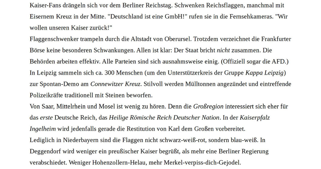 Zur Feier zur deutschen Einheit in Kiel am 03. Oktober 2019 hält Geheimrat Johann Wolfgang von Goethe eine flammende Rede für Toleranz und Empathie. Doch anschließend erklärt sich Wilhelm II. von Preußen erneut zum Kaiser für das wiedervereinigte Deutschland, mit Unterstützung der AfD. In ganz Deutschland brechen Unruhen aus. Reichsbürger ziehen durchs Land. In einigen Großstädten toben Straßenschlachten.