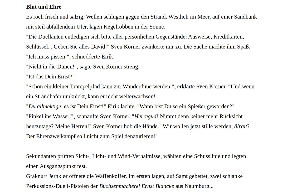 Unter der Hand organisieren die Vikings auch illegale Ehren-Duelle, in denen schleswig-holsteinische Adelige scharfe Mensuren mit tödlichem Ausgang fechten. Eirík Blutaxt und Sven Korner nehmen David mit auf die Insel Sylt, zu einem klandestinen Pistolenduell. Geschützt durch die Dünenlandschaft des Ellenbogen treten sich zwei Ehrenmänner entgegen. Um ihren Disput durch Blut zu reinigen.