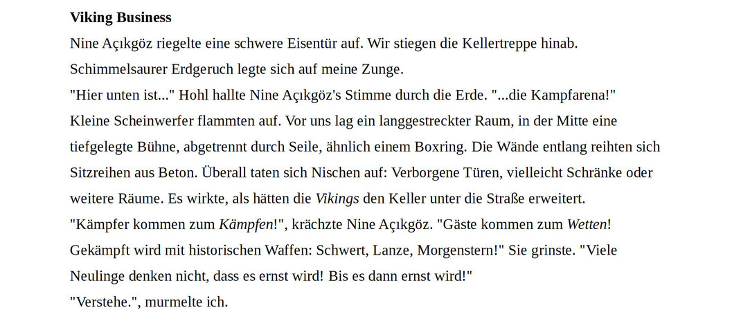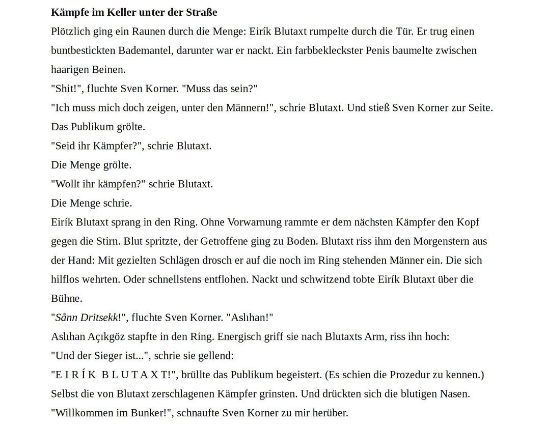 Euphrosine führt David bei den Original Vikings ein: Einem Motorradclub historischer Wikinger, gegründet durch den ehemaligen Seeräuber Eirík "Blutaxt" Haraldson. Europäisches Bestands-Recht erlaubt ihnen, auf dem Krummbuckel einen "Fight Club" zu führen, in dem überlieferte Kampf-Traditionen gepflegt werden: Wikinger-Kämpfe, mittelalterliche Tjousten und barockes Fechten, teilweise mit blutigem Ausgang.