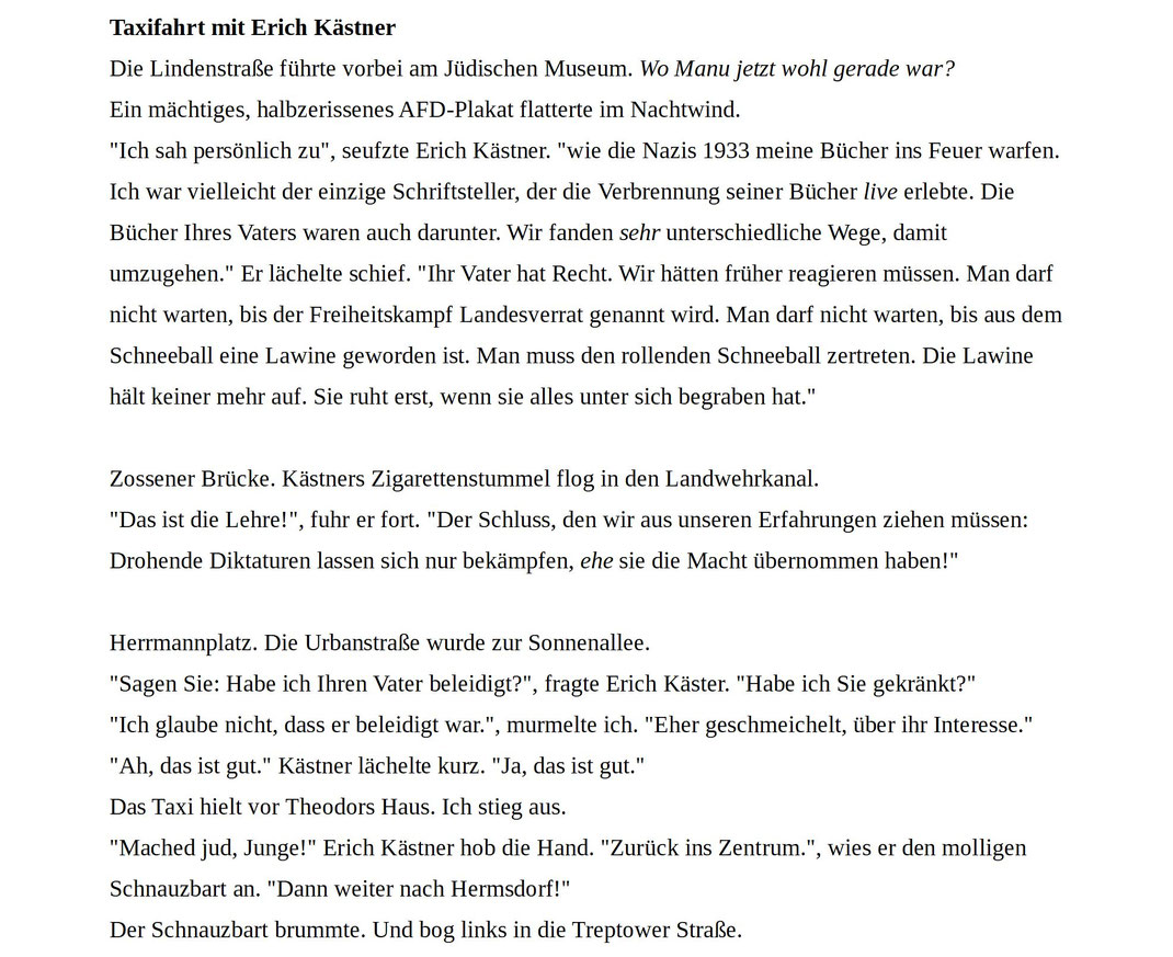 2018 fahren David und Manu zusammen nach Berlin. Manu will die Stadt erkunden, in der er studieren will. David trifft seinen leiblichen Vater E.T.A. Hoffmann, der ein Streigespräch mit Erich Kästner vom Zaun bricht, über den Sinn von Kunst. Am Ende der Nacht fahren David und Erich Kästner im Taxi nach Hause.