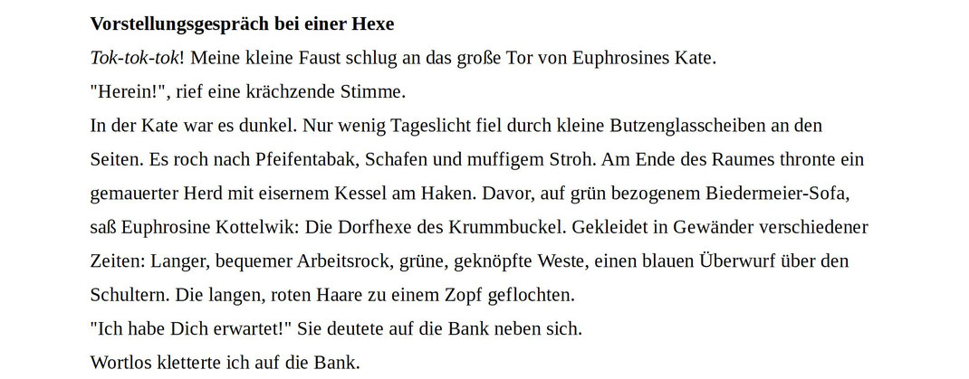 Der 19jährige David Johannes Hoffmann rekapituliert seine Kindheit unter den lange lebenden Schafbauern und Wikingern des Krummbuckel, an der Seite der 800jährigen Dorfhexe Euphrosine Kottelwik. David sucht seinen Platz zwischen gewachsenen Traditionen und dem Aufbruchsgeist einer progressiv-pluralistischen Gesellschaft.