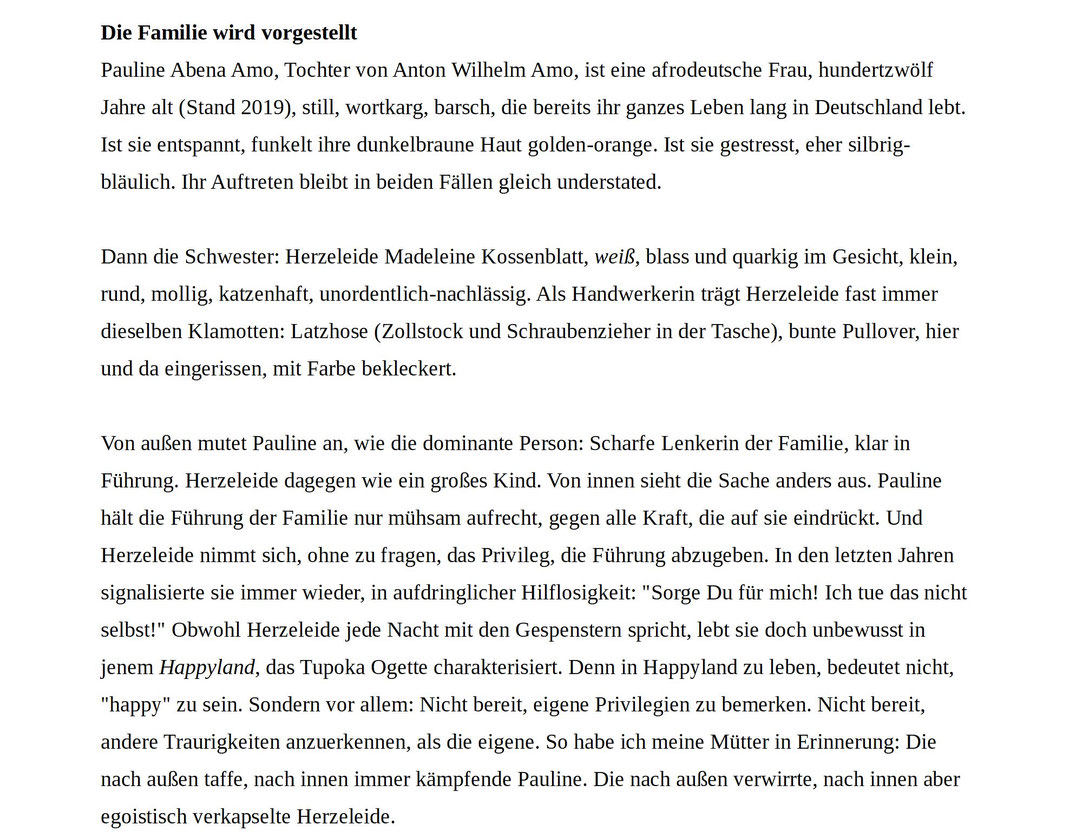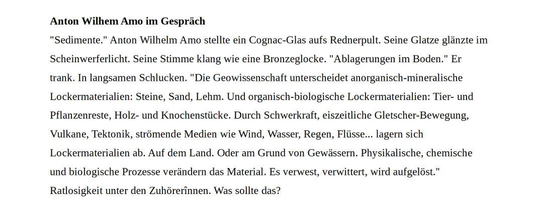 Bei einer Veranstaltung zum Black History Month in Hamburg trifft die Familie auf Paulines Vater, den Menschenrechtsanwalt Anton Wilhelm Amo, der heute als Ankläger am Internationalen Strafgerichtshof in Den Haag arbeitet. Amos Rede eröffnet David die Metapher von den "historischen Sedimenten", die unsere Gesellschaft durchziehen.