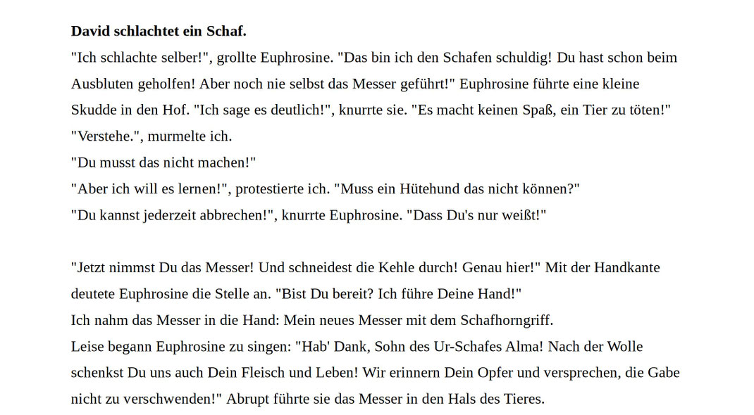 Im Alter von fünf Jahren meldet sich David freiwillig zur Arbeit bei der "Dorfhexe" Euphrosine, um Geld für seine Familie zu verdienen. Euphrosine benutzt ihn zunächst, um Nachbarn auszuspionieren. Sie lehrt ihn traditionelles Brauchtum: Das Pflegen von Schafen, den Umgang mit Wölfen und Bürokraten. Vor allem aber: Das Beobachten von Menschen, und das Erzählen von Geschichten, die den Schmierstoff fürs Zusammenleben bilden.